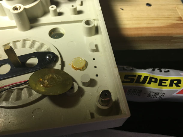 圧電ブザーを再接着するために、接着剤を塗ってしばらく待ちます(瞬間接着剤ではないので)。
