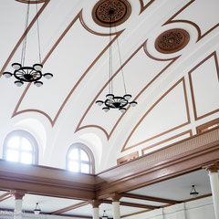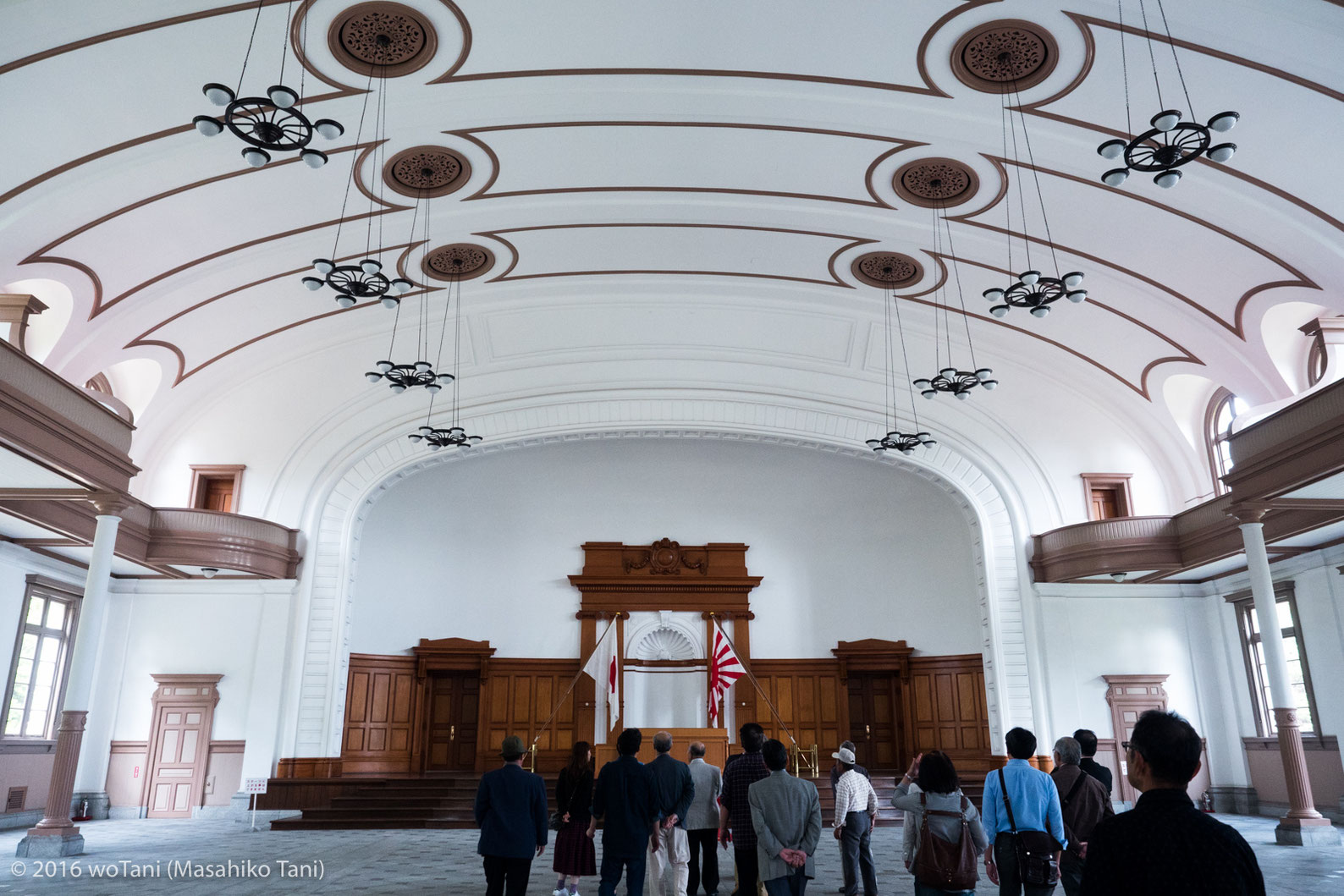 最初の見学は「大講堂」です。兵学校生徒の入校式、卒業式などが行われ、内部は吹抜けで音響設備がなくても非常に声が響く造りとなっています。