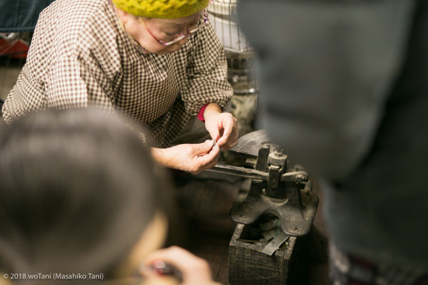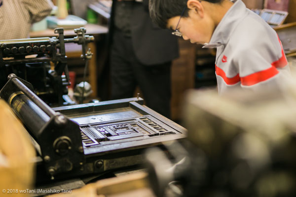 活版印刷の原盤(版組)を見入る若人と活版職人。。活版印刷では原稿を元に活字(鉛を主成分)などを並べて版組を作成します。既存の活字に無いものは既存の活字を元にカスタマイズして作成することもあります。