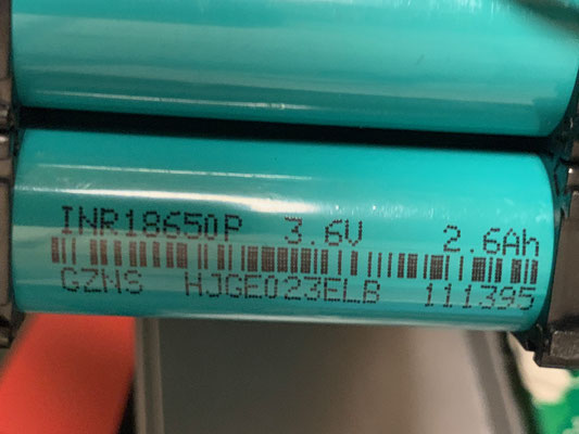内蔵のバッテリーは「3.6V 2.6Ah 18150」で、型式は「INR18650P」を使用しています。