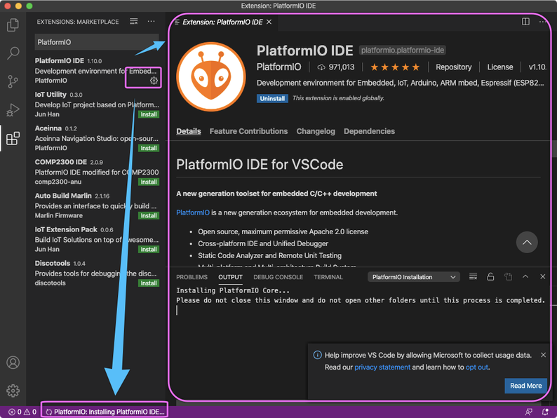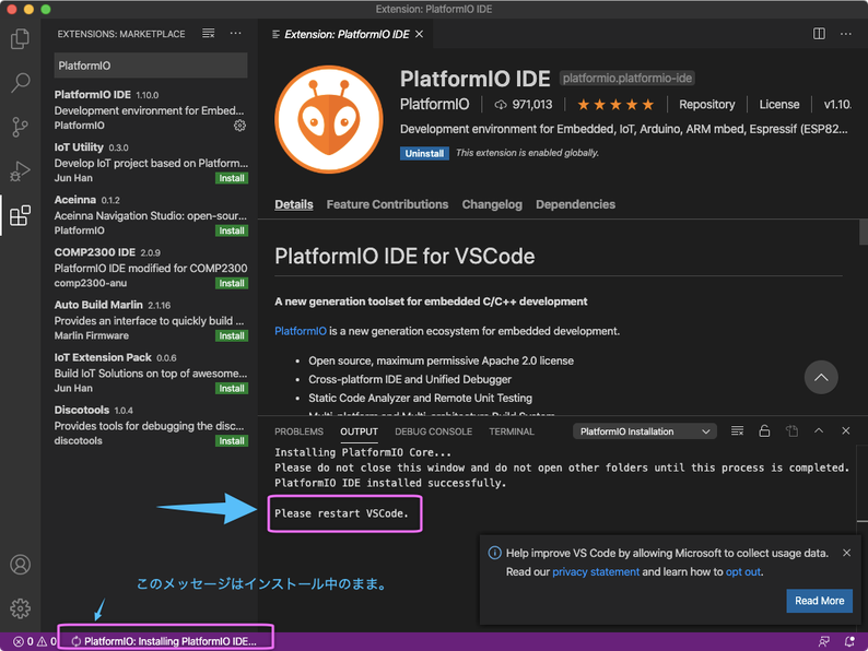 PlatformIO IDEのインストールが終わると「OUTPUT」に「Please restart VSCode.」と表示されます。画面左下のインストール途中のメッセージは変化ししません(インストール途中のままです。)