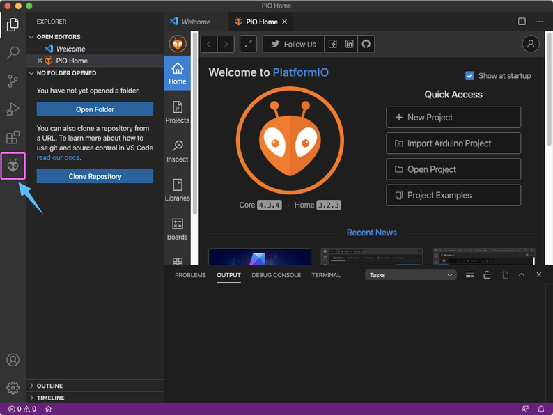 左のバーにPlatformIOのアイコンが追加されます。