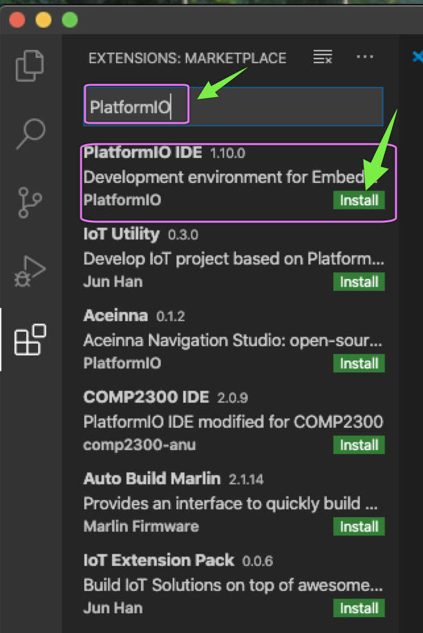 「PlatformIO」を検索し「Install」します。