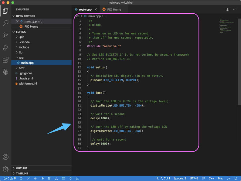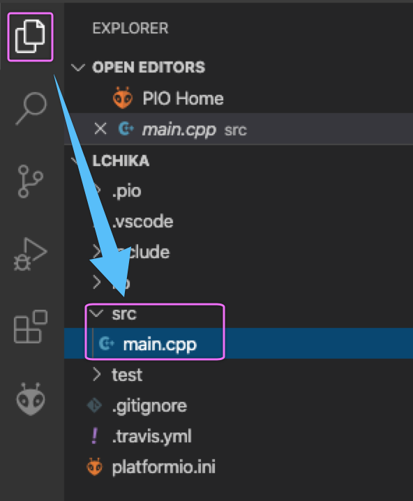 Arduinoの作法とは異なり「main.cpp」にコードを書きます。
