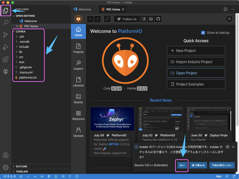 > Lチカのコードはプロジェクト作成時にデフォルトで入るようである。