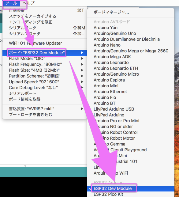 「ツール」 > 「ボード」>「ESP32 Dev Module」