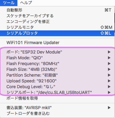 「ツール」 > 「シリアルポート」>「……/cu.SLAB_USBtoUART」