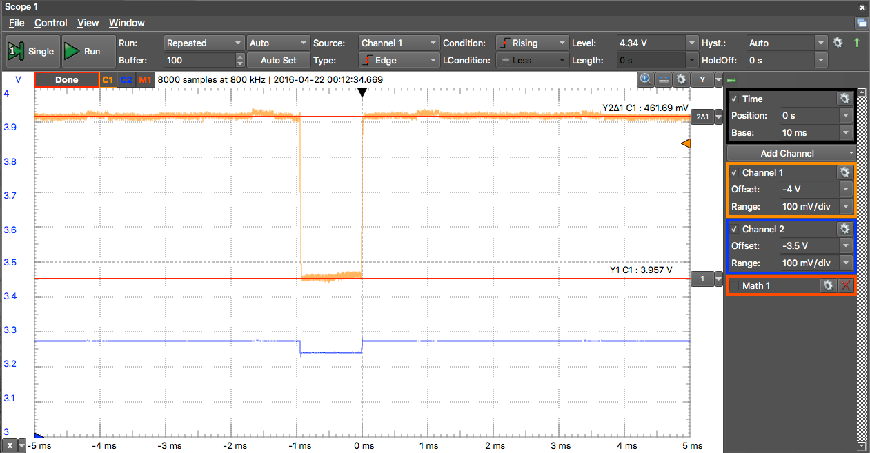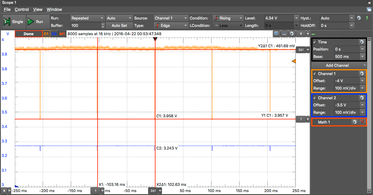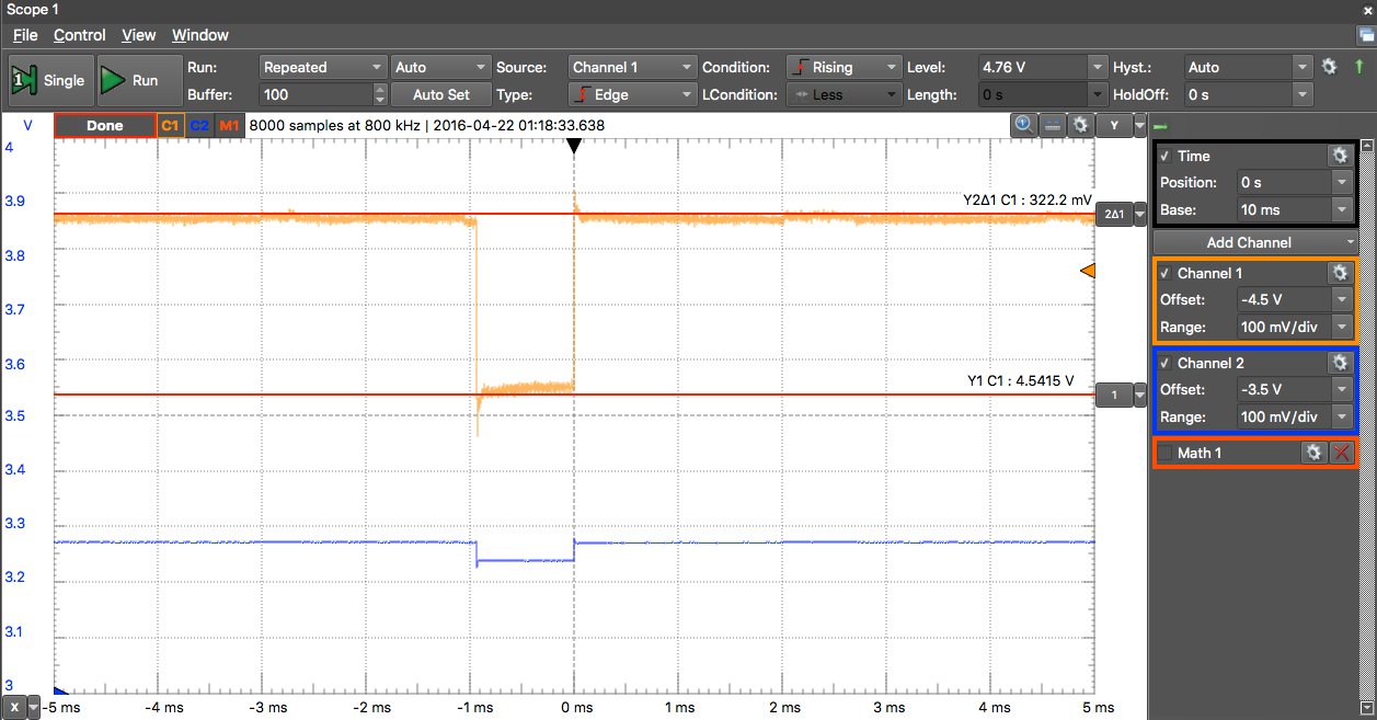 電圧降下はピークで約320mV、周期は約100ms(Wi-Fiモード時)で、周期はプログラムが同じなのでパスワート同じです。。