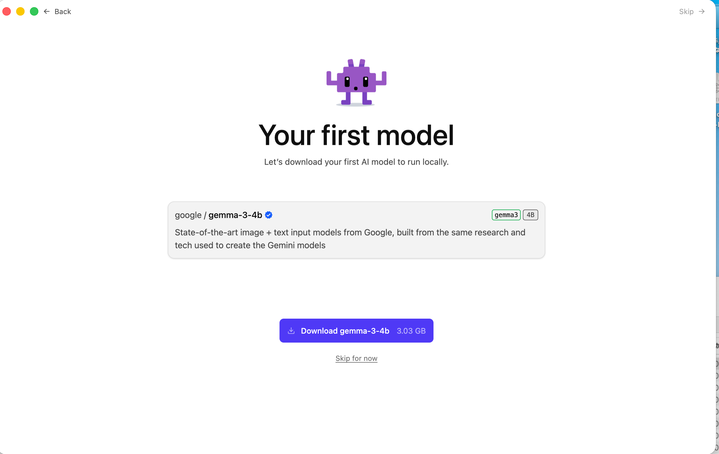 とりあえずデフォルトで指定されている「Download gemini-3-4b」ボタンを押してダウンロード(約3GB)とします。後からAIモデルは追加ダウンロード出来ます。