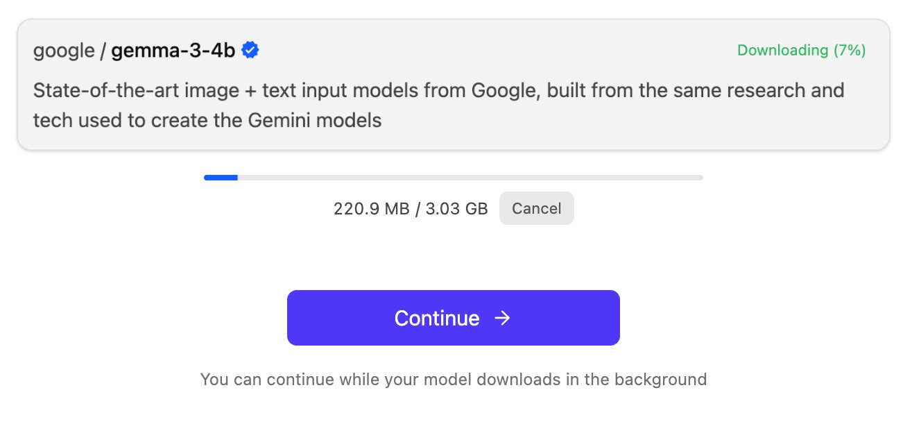 AIモデルのダウンロードが完了したら「Continue →」ボタンを押して次の画面を表示します。
