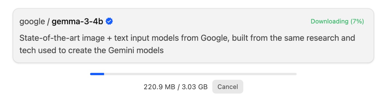 とりあえずデフォルトで指定されている「Download gemini-3-4b」ボタンを押してダウンロード(約3GB)とします。後からAIのモデルは追加ダウンロード出来ます。
