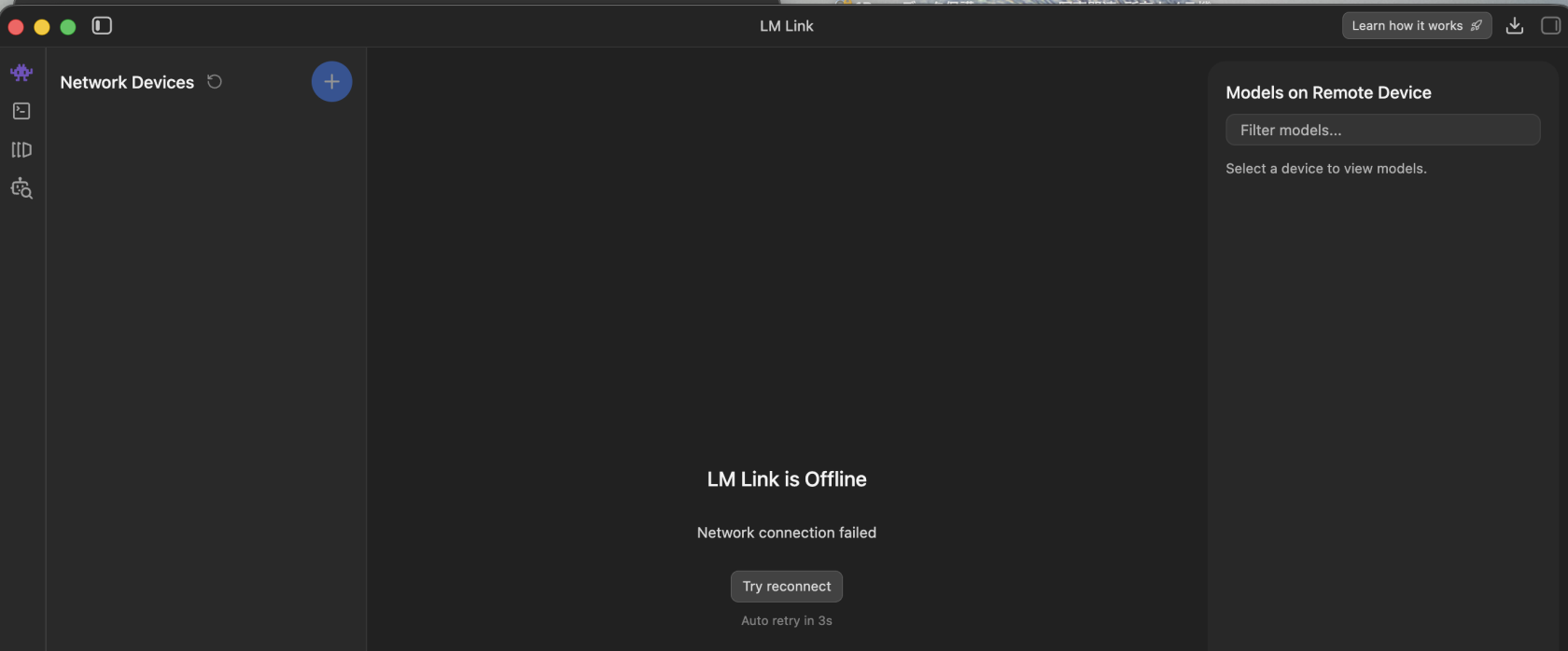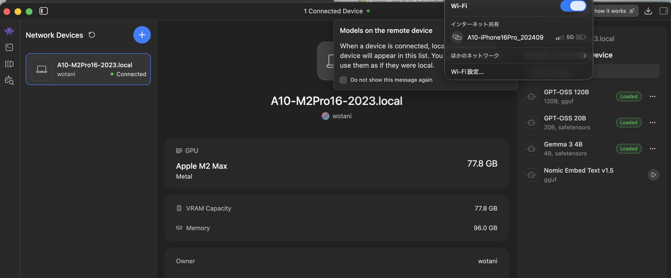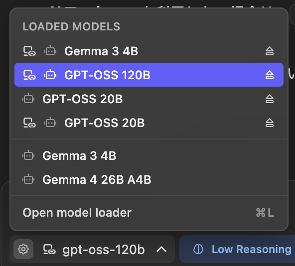 「LM Studio」アプリは10秒間隔で接続を試みるようで、ネットワークに接続すると自動的にLLM実行PCに接続出来ました。