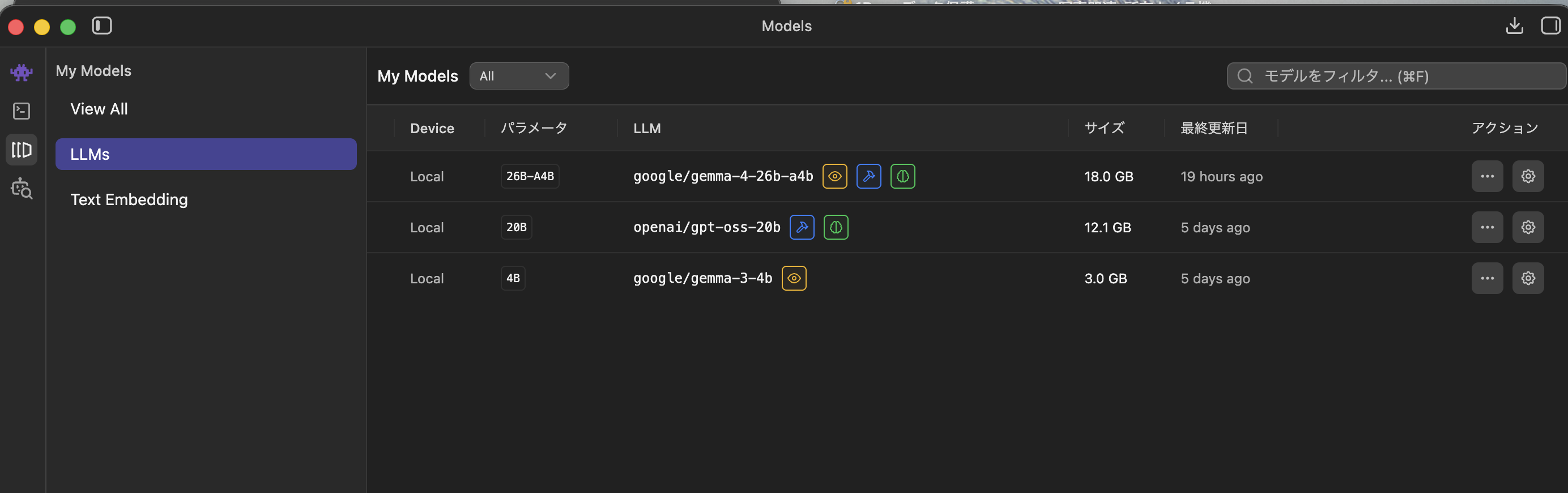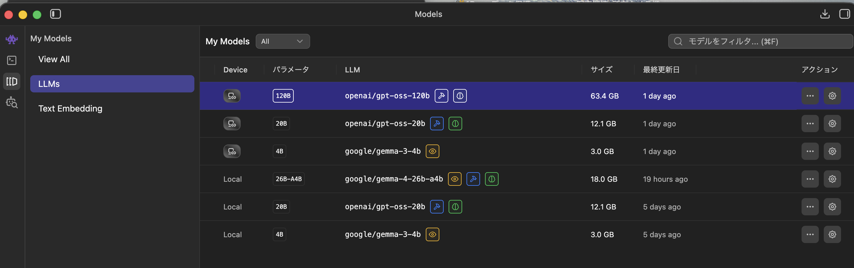 参考にLLM実行PCへ接続したときと未接続時のモデル一覧です。