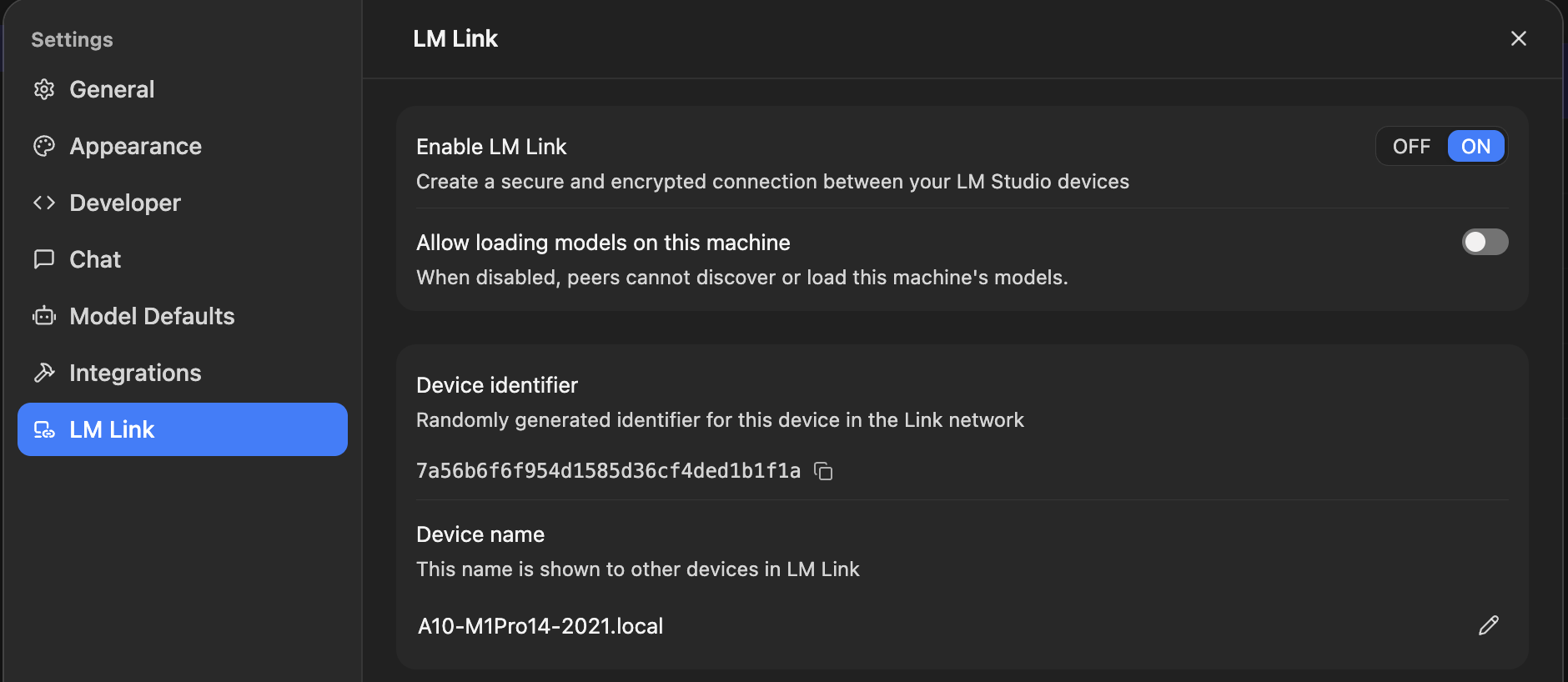 「LM Studio」アプリが自身のローカルモデルを非公開にするには非公開にしたいPCかーの設定を変更します。「Settings > LM Link」の「Allow loading models on this machine」をOFFにします。