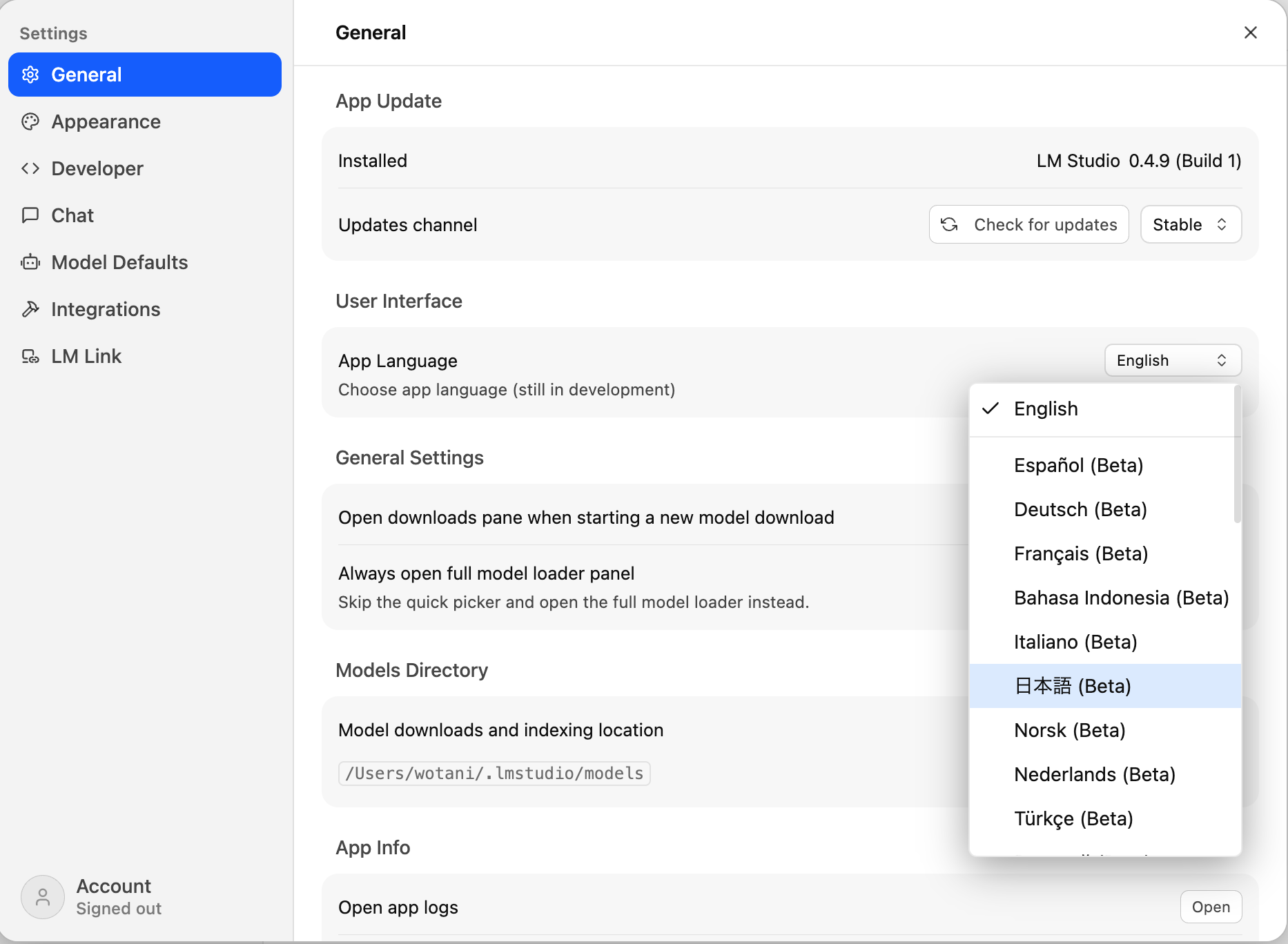 画面左下のアイコンをクリックして設定を開き「Genelal > User Interface」の「App Language」から「日本語(Bate)」を選択します。直ぐにSetting関係の表示の一部が日本語になりましたが、念のためにアプリを再起動します。