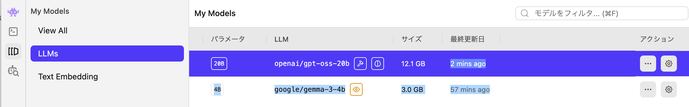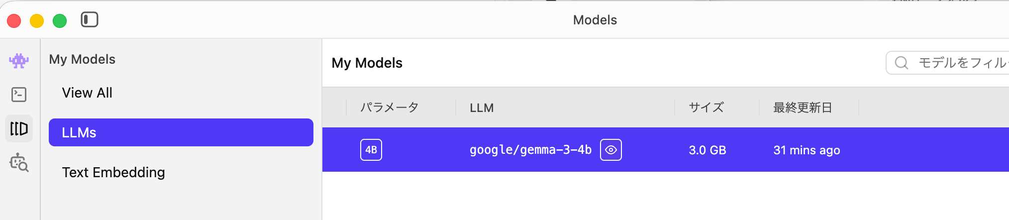 現在、使用出来るモデルを確認します。インストール時にモデルをダウンロードしていない場合には、この画面でモデルをダウンロードしてしてください。