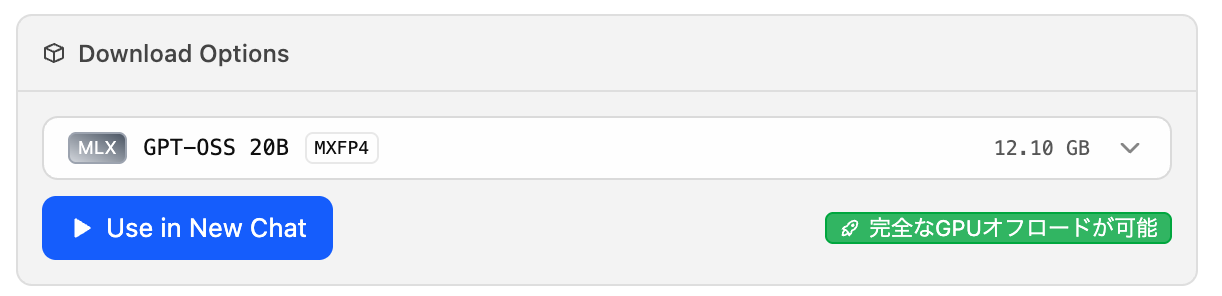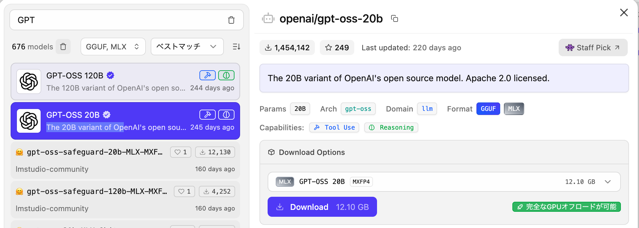 今回は、GPTで検索してモデルを確認します。120B(約63GB) と20B(約12GB)のの2つが見えますが、20B(約12GB)の方を選択して「Download」します。