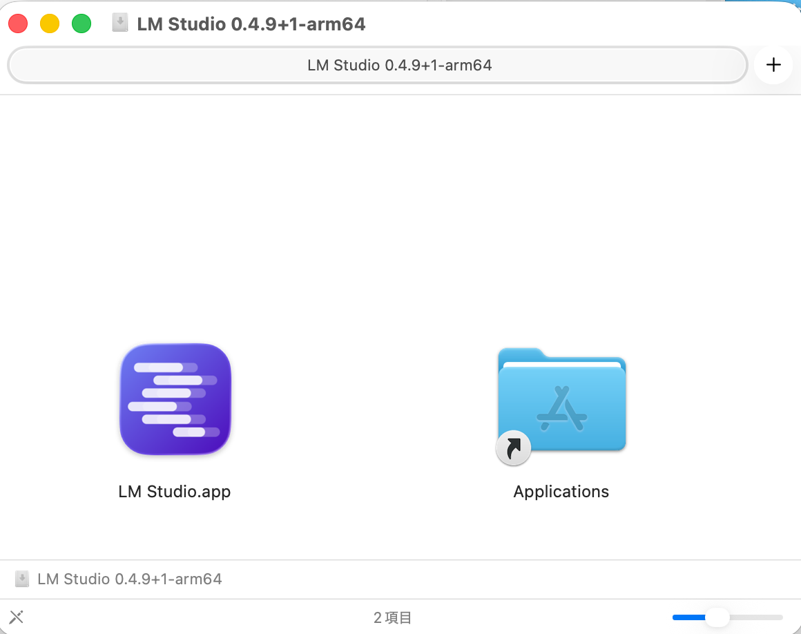 dmgファイルを開いて、「LM Studio」をApplicationsフォルダーへコピーします。