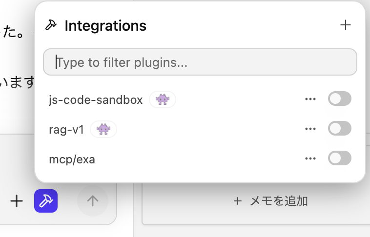 チャットウインドウで設定したMCPを使用出来る様に変更します。Integrationsアイコンをクリックして一覧を表示します。一覧中に追加したMCPが「MCP/exa」として表示されています。チェックをONとします。