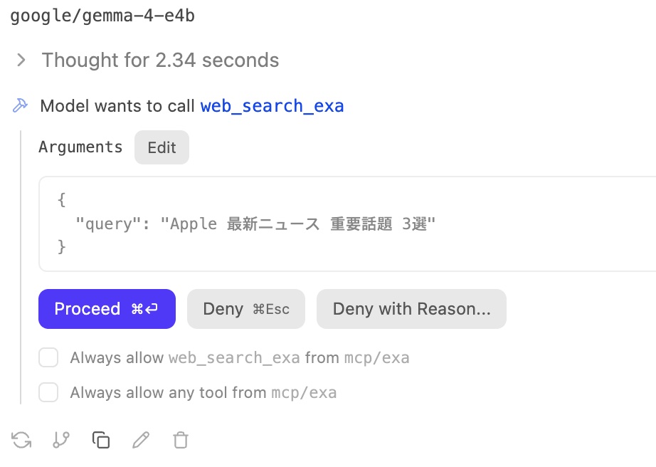 簡単に動作を確認してみましょう。通常通り質問などしても使用しているモデルがWebへのアクセスが不必要と推論したらMCPは使用されません。次のように具体的にWebアクセスをする質問とします。