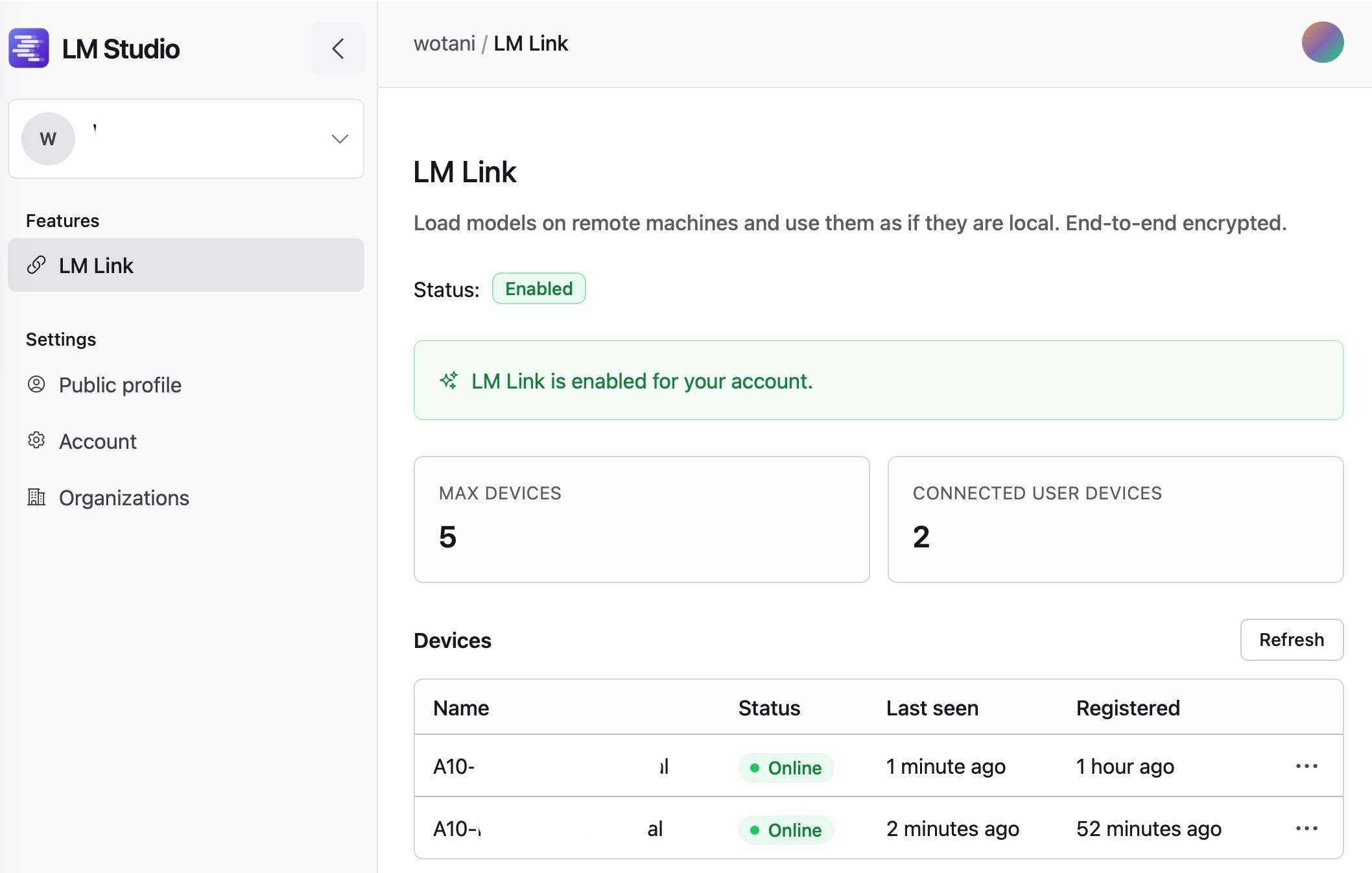 LM Studio Hubで登録されているデバイスを確認します。1ユーザー当たり最大5台なので画面からは2台登録されています。