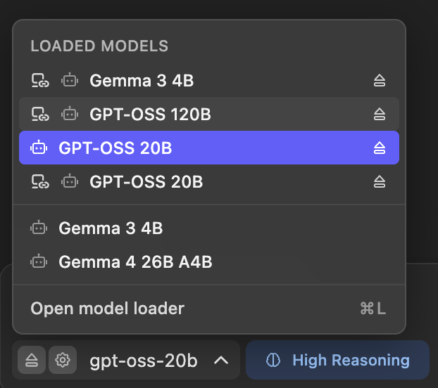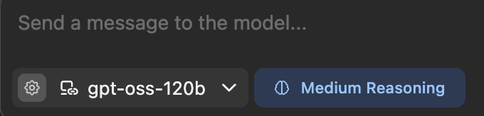 次にメッセージ入力枠から使用するモデルを選択します。この時、LLM実行PC上のモデルも見えていると思います。ここでは「GPT-OSS 120B」を選択します。