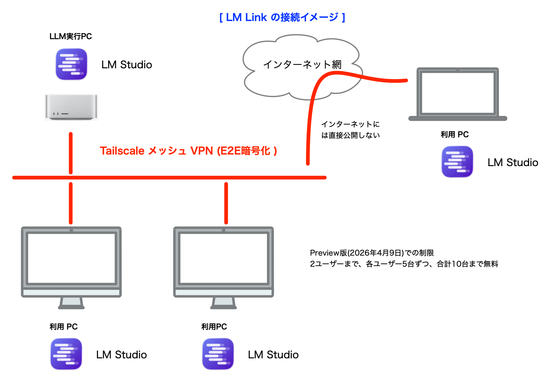 LM Linkは「LM Studio」のアカウントでデバイス同士をリンクする仕組みであり、ローカルネットワーク内だけでなく、離れた場所にあるPCやクラウド上のマシンにも接続して利用できる点が特徴です。デバイス間の接続にはTailscaleメッシュVPNが利用されており、エンドツーエンドで暗号化された安全な通信が行われます。