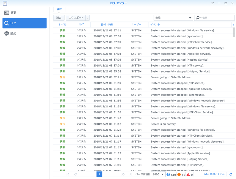 NASのログ例: ネットワーク UPS接続側 シャットダウン時間はUPS接続されているNASより早く行われている。 次の順番で終了1.ネットワーク UPS接続側2.UPS接続側