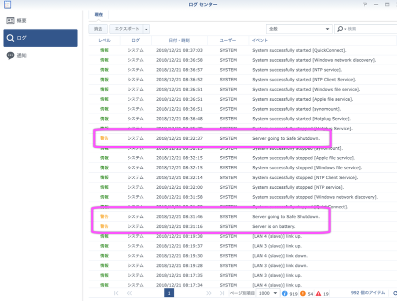 NASのログ例: UPS接続側