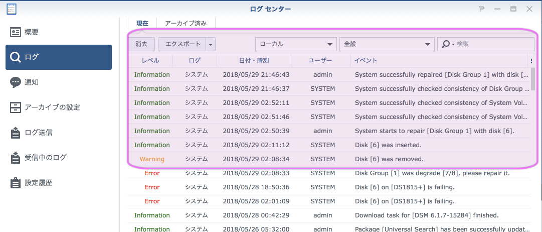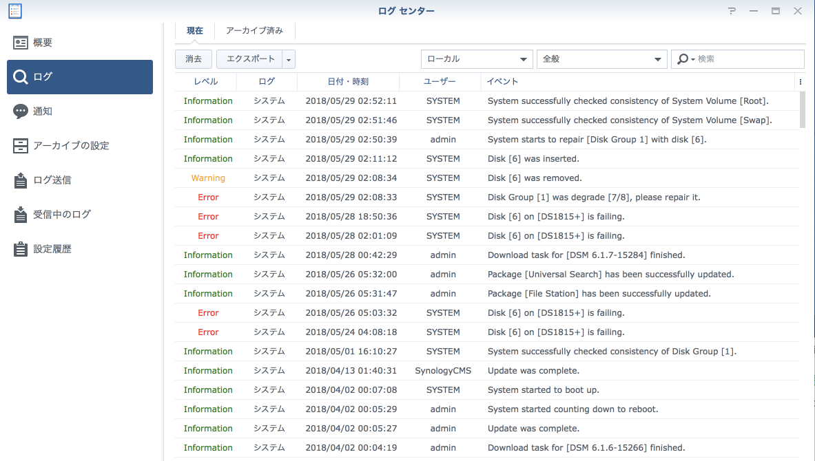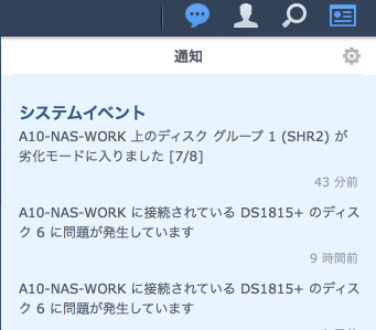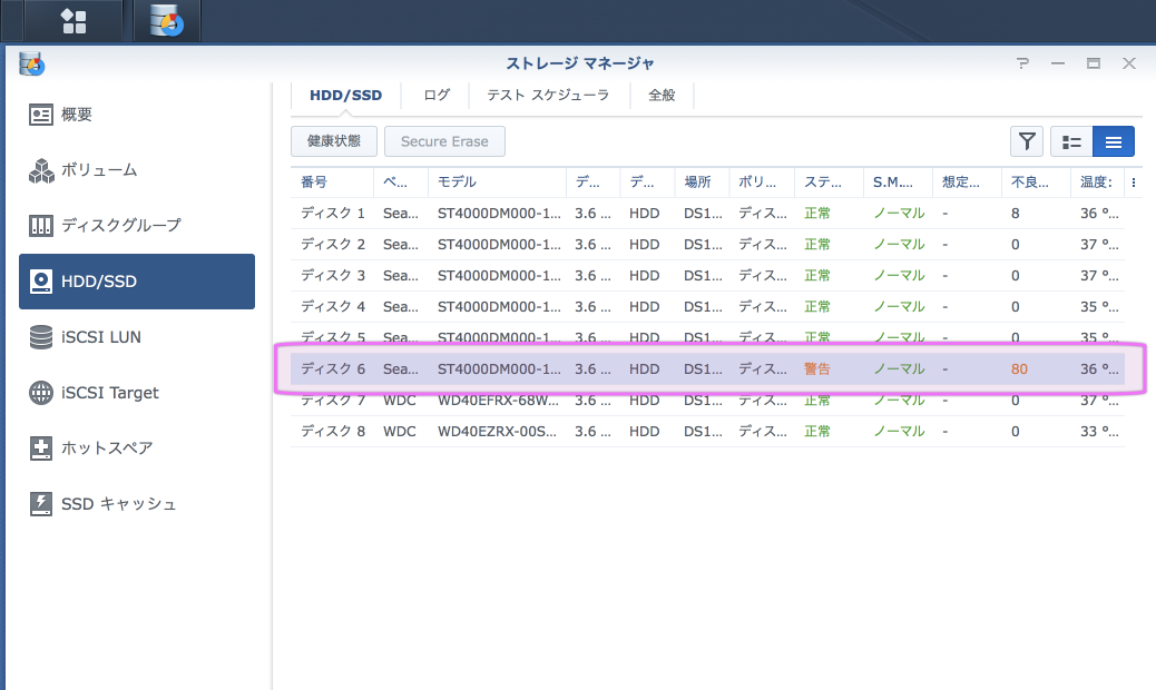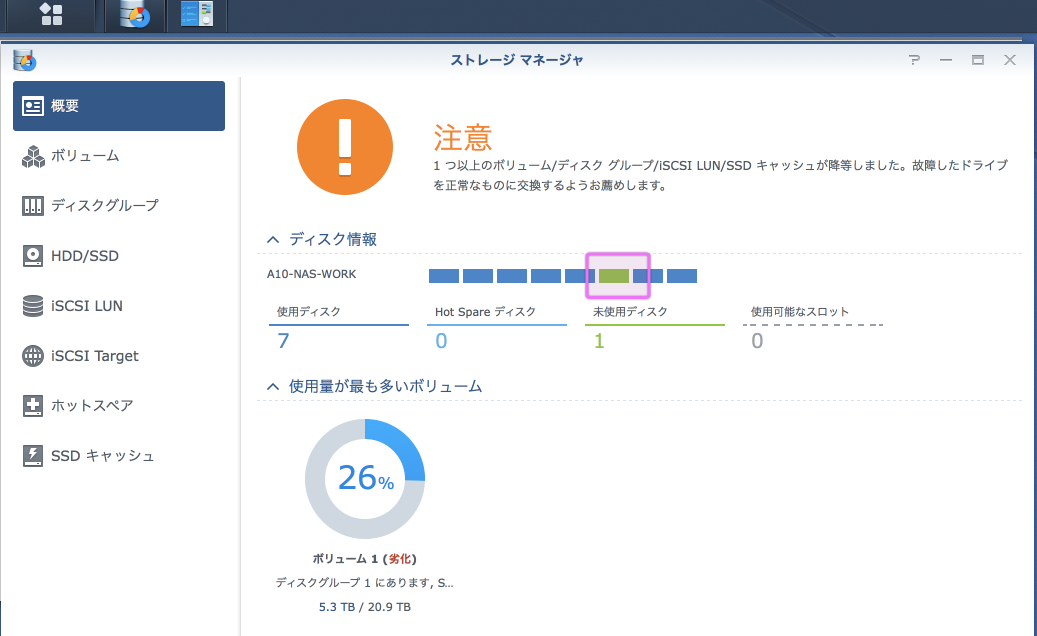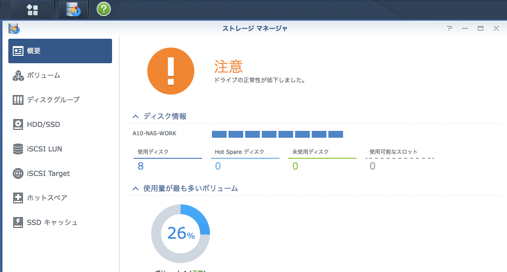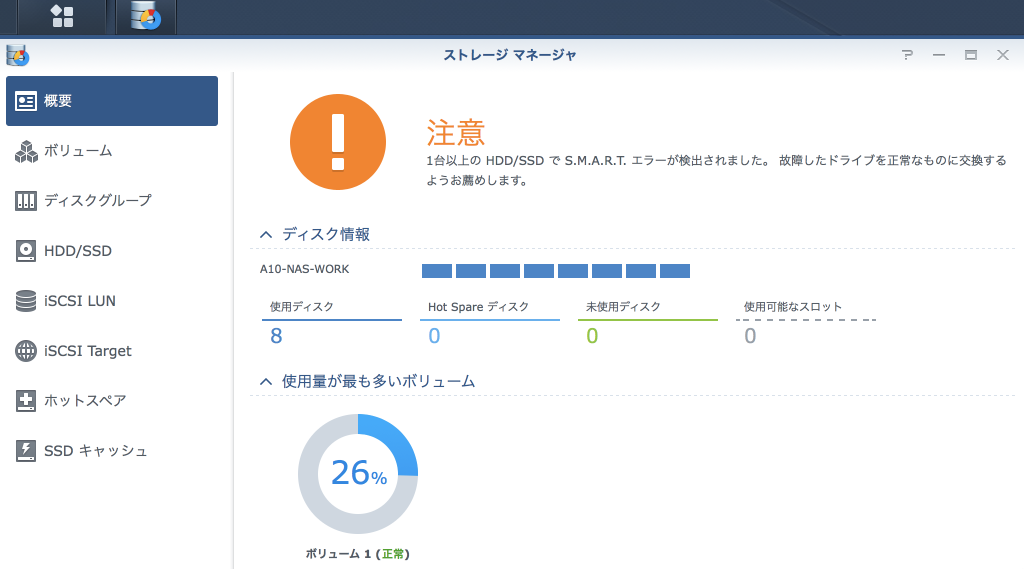 SynologyのNASでは不良セクターが一定数を越えると警告を表示する事がでます。設定により使用しているディスクの不良セクターに問題が発生すると「注意」が表示されディスクに対して適切な処理を実施する必要が生じます。今回はディスクの不良セクターが設定値以上になったので「注意」となってディスク交換を実施し問題を解決しました。