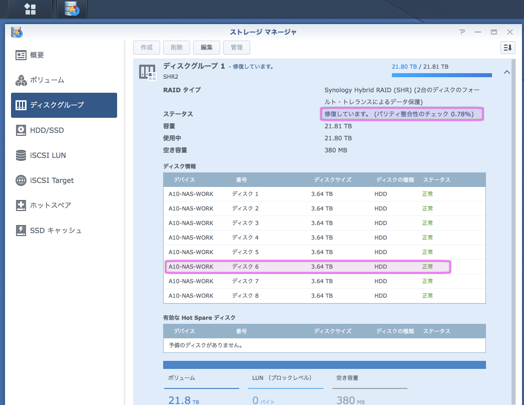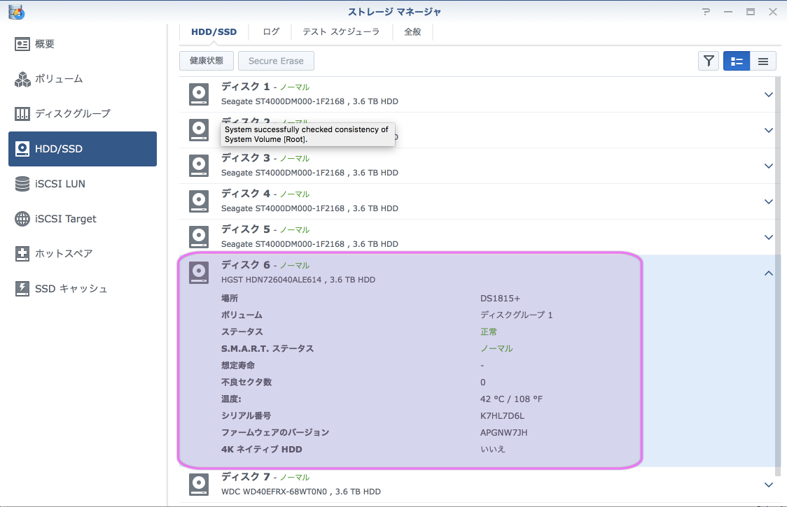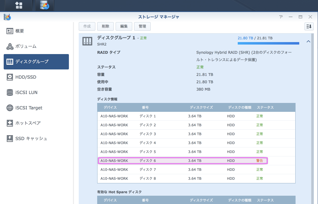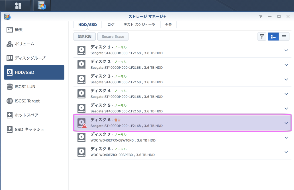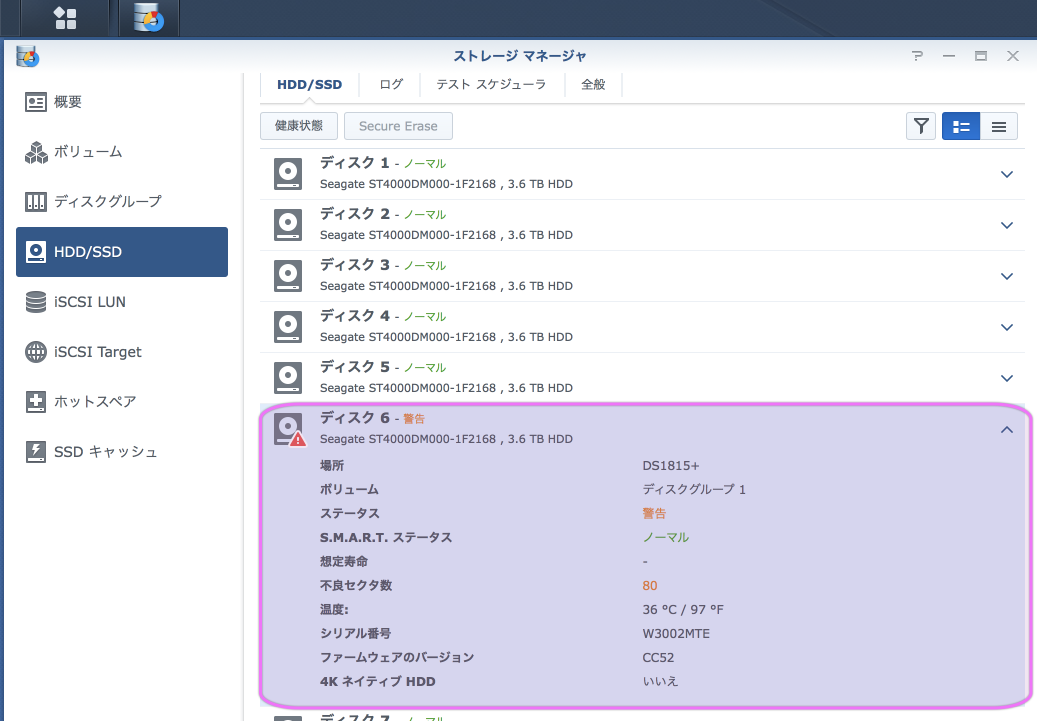 「ディスクグループ」から「ディスク6」のステータス「警告」が確認できます。