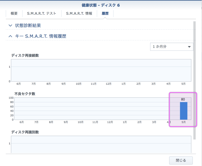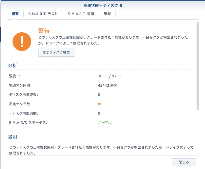 ディスク(HDD)の不良セクターが設定値以上になり表示に「注意」が表示されて、ディスクの確認から交換して修復までした。