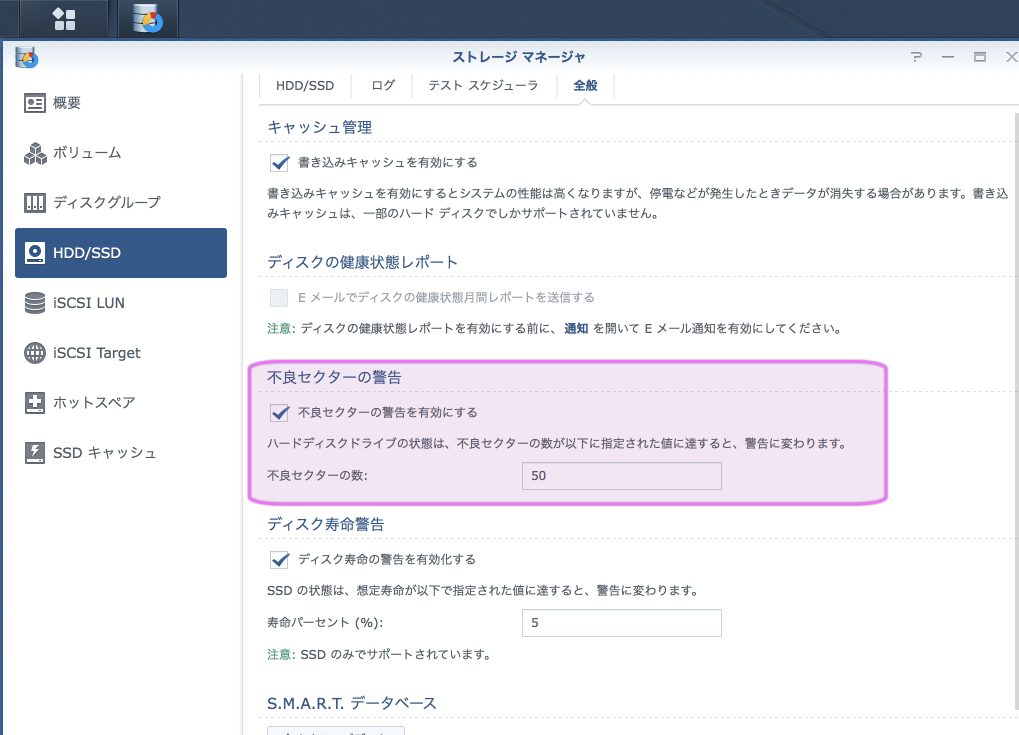 「ストレージ マネージャ」の「全般」から「不良セクターの警告」の設定を再度確認します。