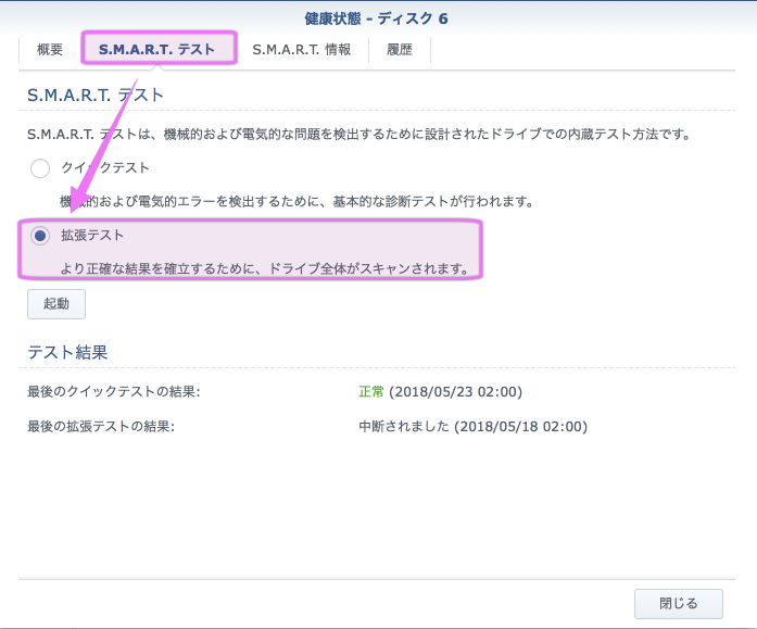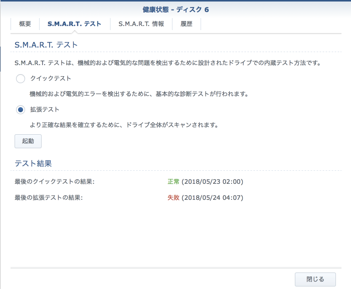 不良セクターが発生したディスクに対して「S.M.A.R.T.テスト」の「拡張テスト」を実施してみます。