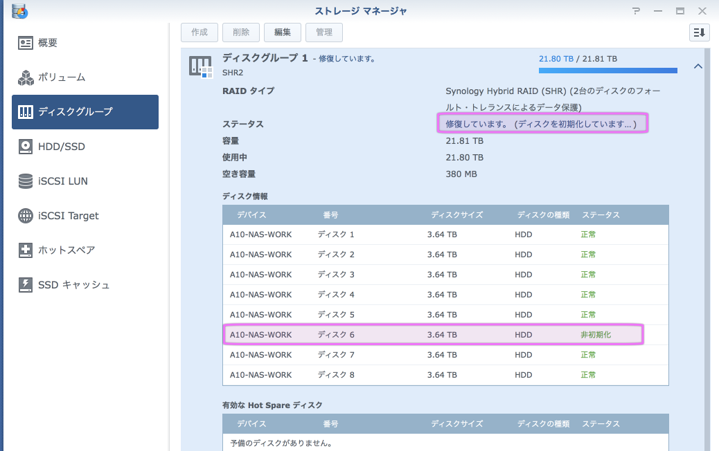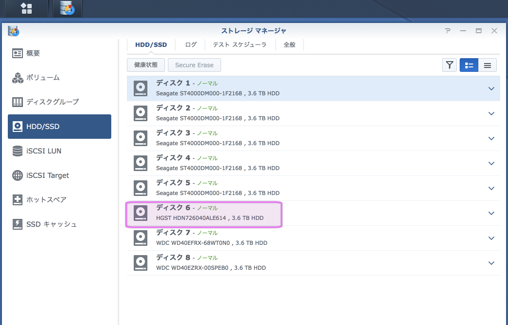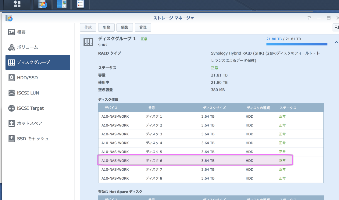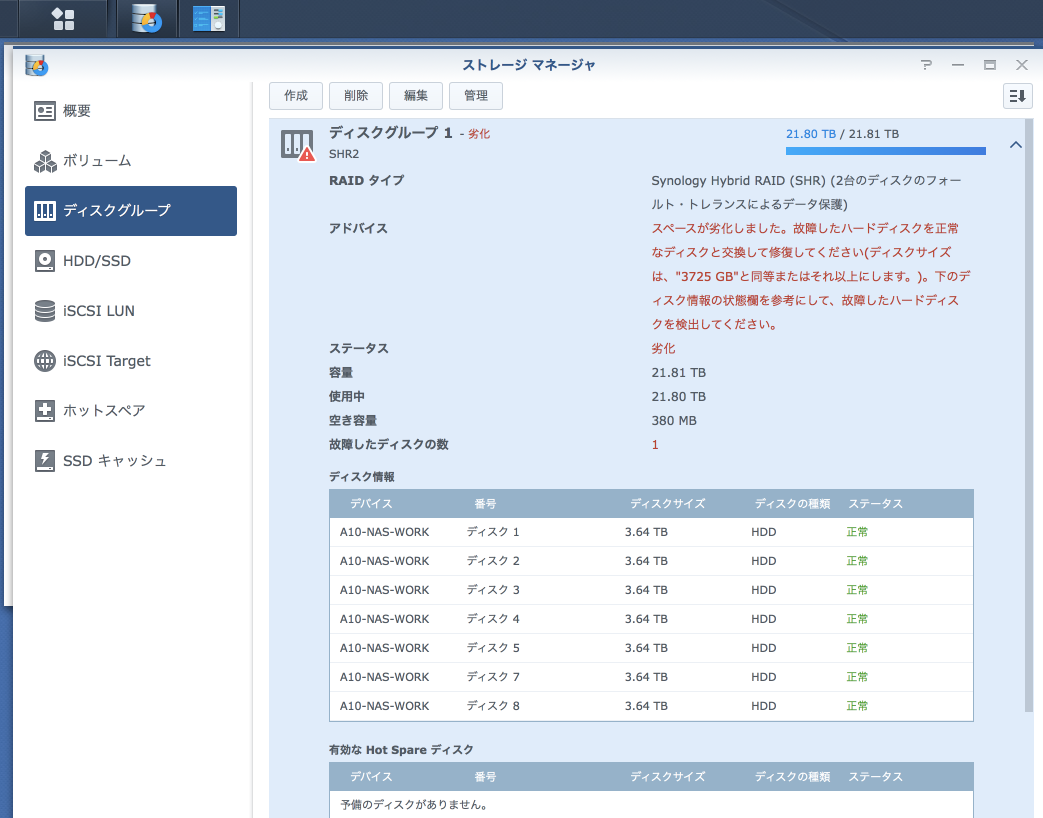 HDD(ハードディスク)の不良セクターが一定数以上を越える(NASの設定による)と「注意」表示が表示されるので、HDDの交換を実施しました。