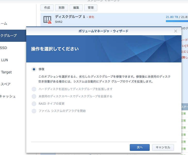 新しいディスクを挿入/認識後「ディスクグループ」の「管理」ボタンを押して「修復」を選択します。