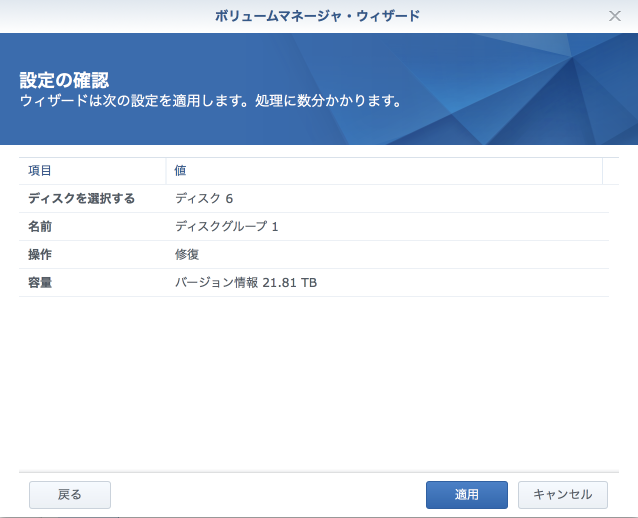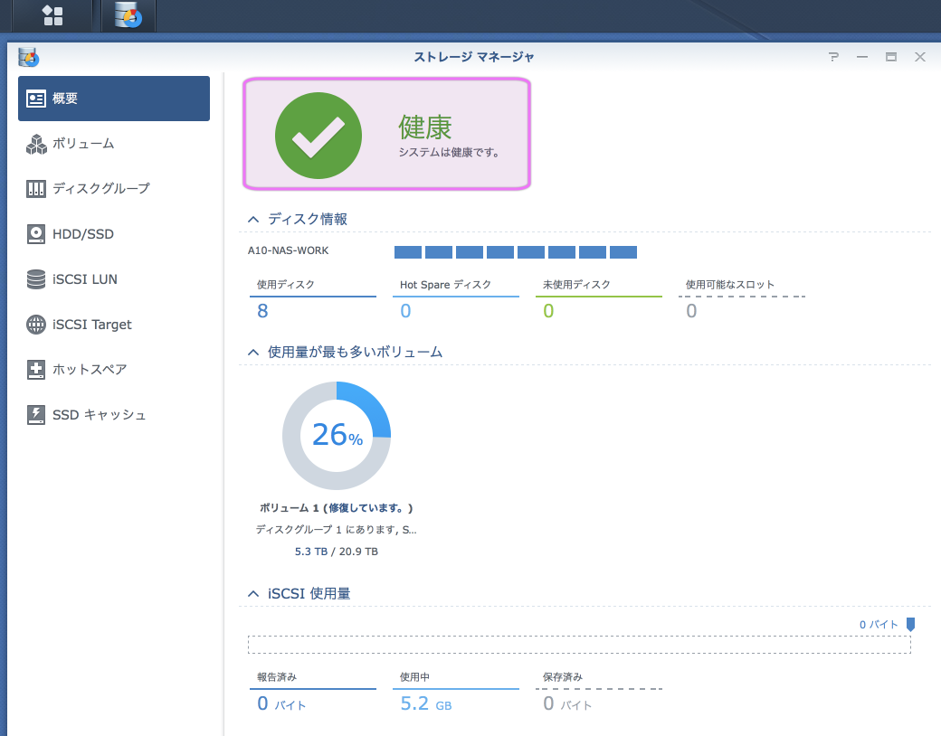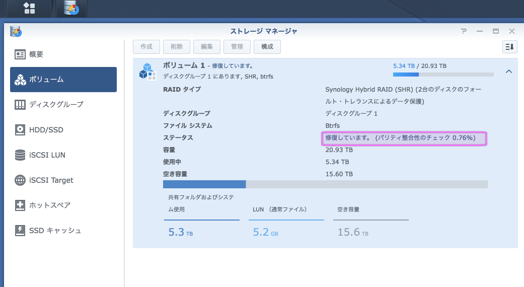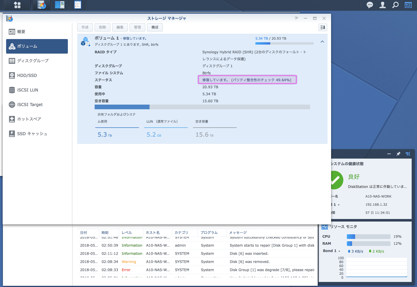 ディスクの交換から修復完了までは今回は約20時間でした。