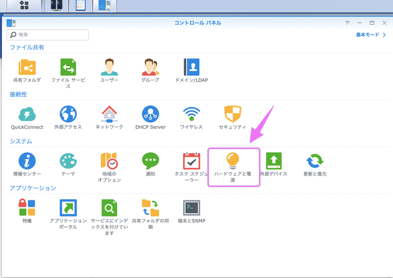 DSMの[コントロール パネル] > [ハードウェアと電源]を選択します。