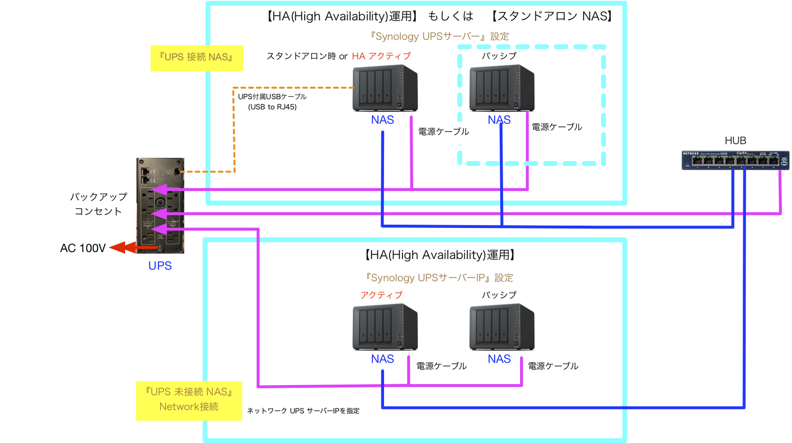 記事の設定に従って行われたUSPなどの構成図です。HA構成の2つ使ってUPSを構築しテストしました。 使用したUPSは550AVとNAS 4台とHUBをバックアップするには容量不足を感じました。それでもAC100V断で30秒間運用とセーフモードに移行しNASの終了と再起動を安全に実行することが出来ます。