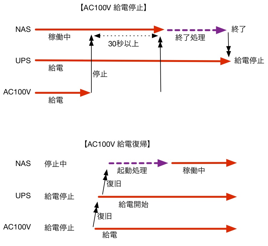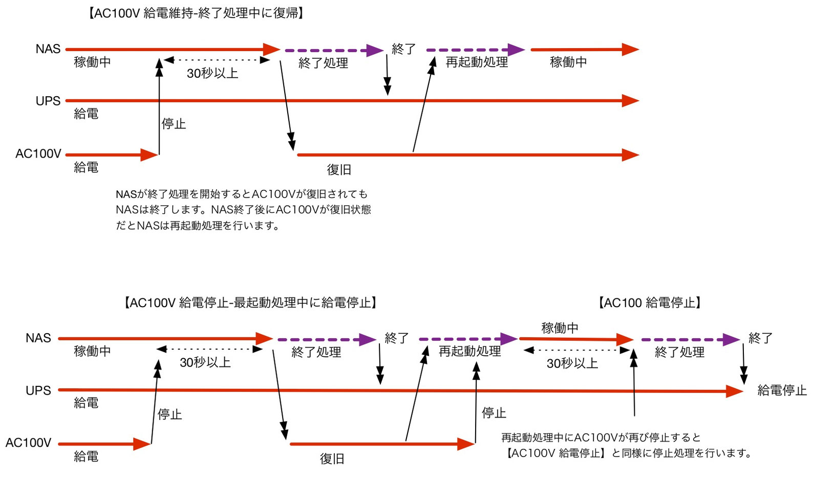 停止時はNASで設定された時間の経過後にNASの終了処理を行い、その後にUPSは停止します。