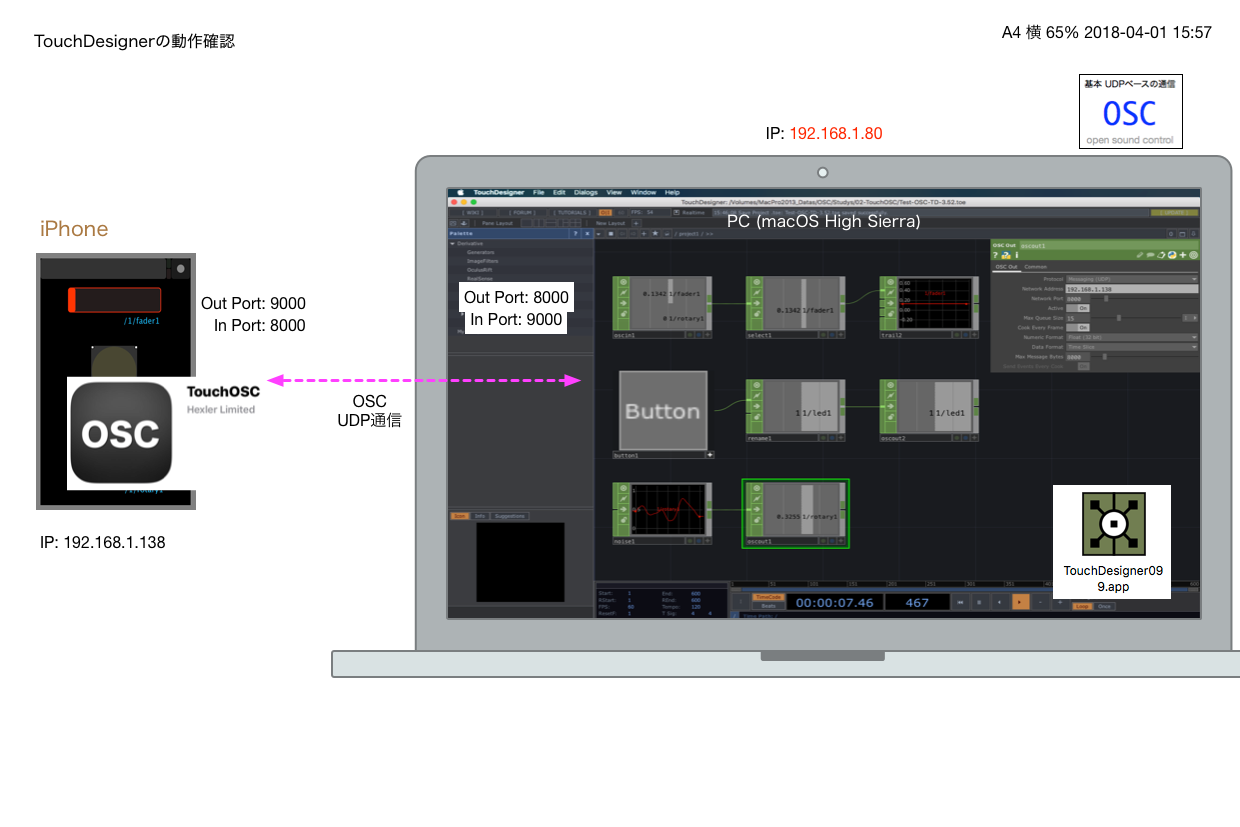 今回、動作確認を行った環境は図のようにiPhoneのTouchOSCとOSCで通信しました。