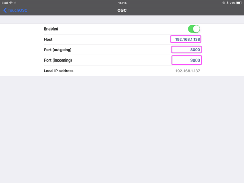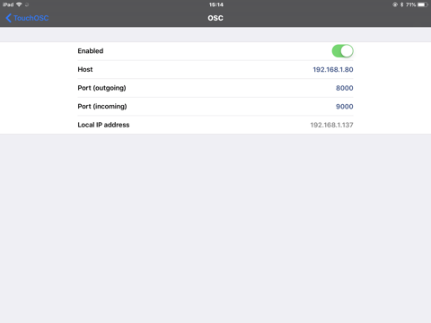 Host: 相手側のIPアドレスなどPort (outgoing): OSCの出力ポート番号 (iPhone側のincoming)Port (incoming): OSCの入力ポート番号 (iPhone側のoutgoing)Local IP address: 現在のデバイスのIPアドレス
