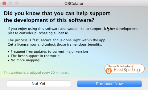 そして、一定時間後(10秒程度)にダイアログを閉じるボタン「Not Yet」がアクティブとなりボタンを押すと再度稼働します。この動作は購入しライセンスが認証されるまで続きます。