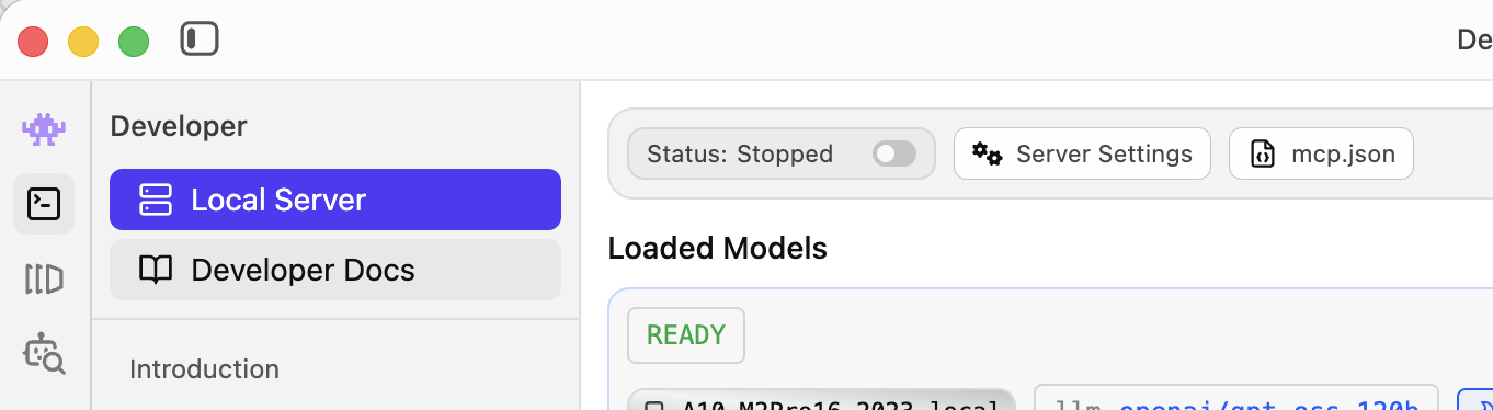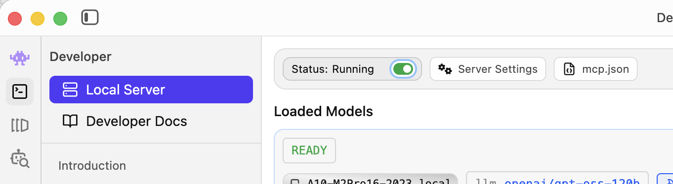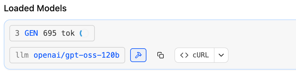 モデルを選択するとロードが必要な場合にはロードを始めます。この状態は「LM Studio」のDeveloper画面から確認出来ます。
