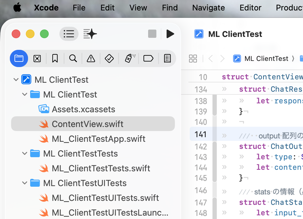 次にXcodeでプロジェクトを開きます。Xcodeで「LM Studio」のローカルLLMに接続したときに直ぐにテストするためです。