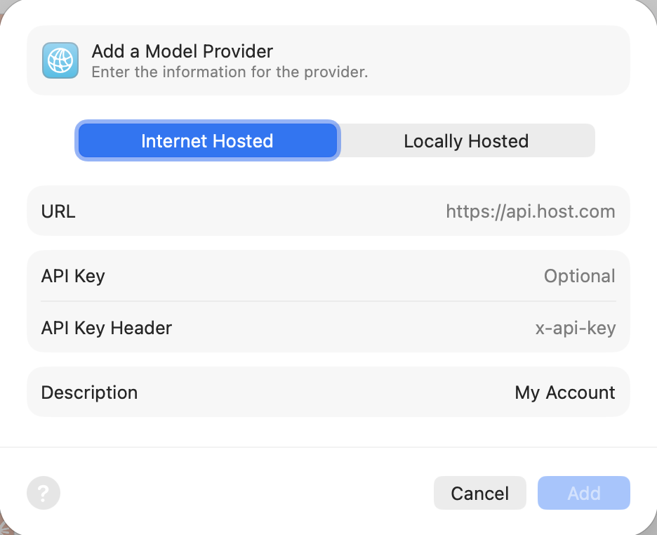 Chat 項目で「Add a Chat Provider...」をクリックし、次の様な登録画面を開きます。