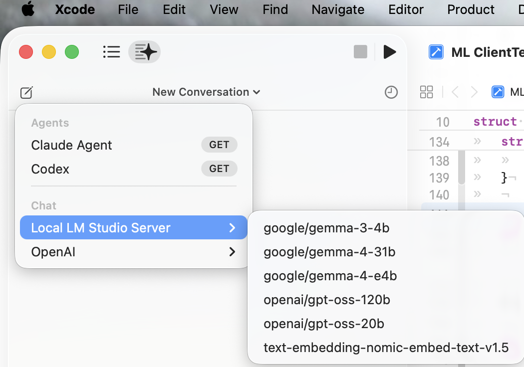 XcodeのプロジェクトからChatメニューを選択して使用したいモデル を選択します。今回は「LM Studio」のLocal LM Studio Serverを選択しモデルを選択します。今回は「openal/gpt-oss-120b」という大きな物を選択してみました。